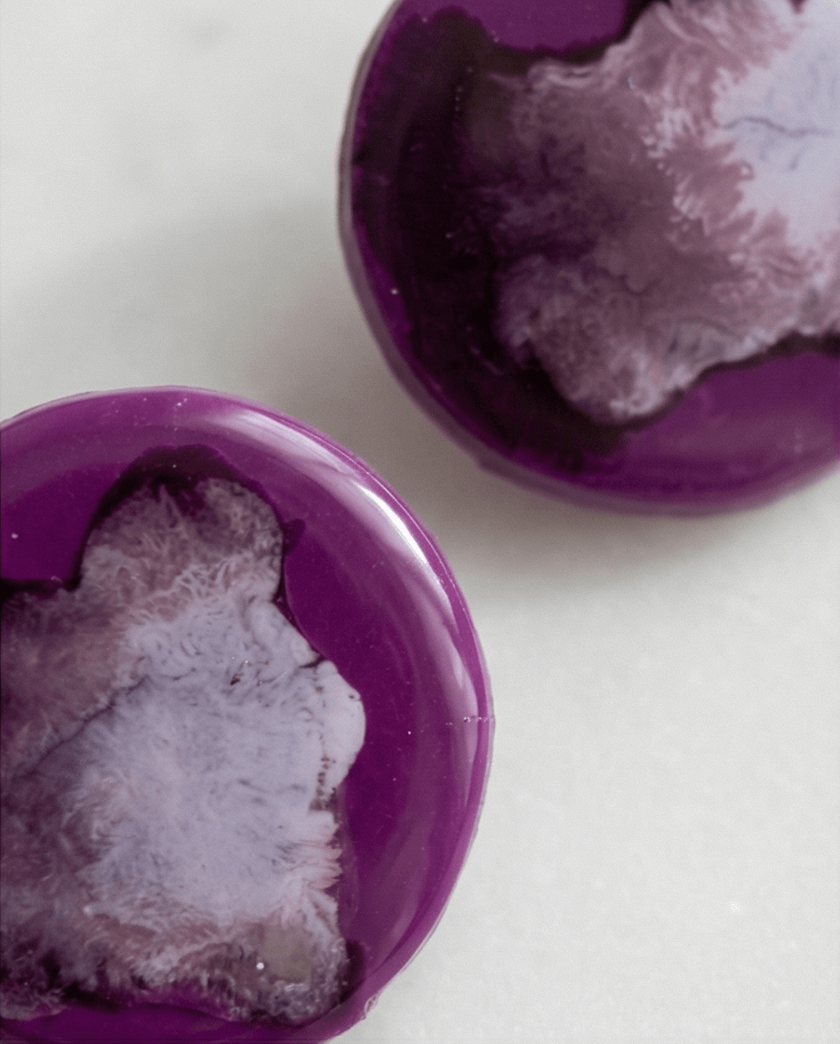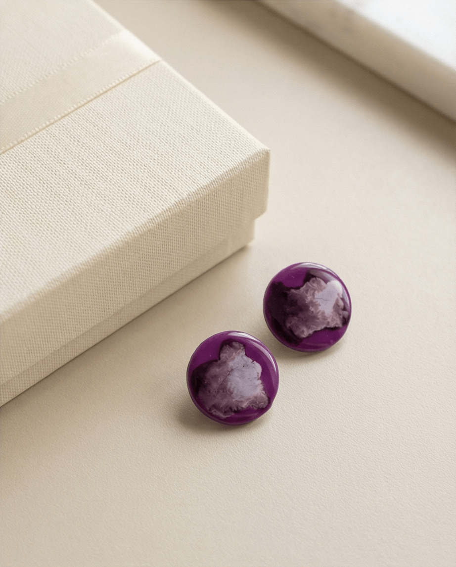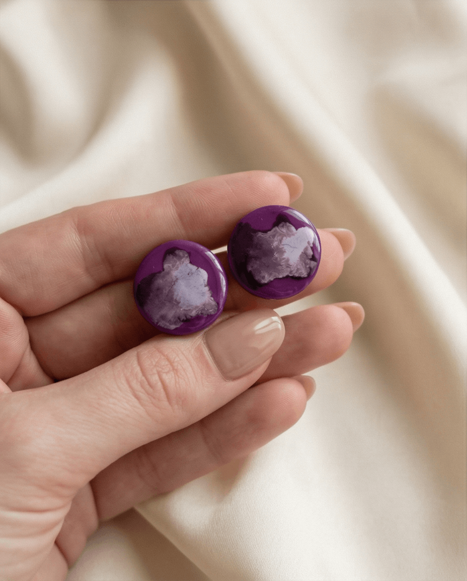 Δημιουργήστε έντονο, καλλιτεχνικό statement με τα “Violet Impact”, μεγάλα καρφωτά σκουλαρίκια σε στρογγυλό σχήμα από πολυμερικό πηλό. Η ζωντάνια του μωβ συνδυάζεται με την χρωματεία πνεύματος, προσφέροντας δυναμική κίνηση και βάθος που αλλάζει με το φως και την κίνηση.