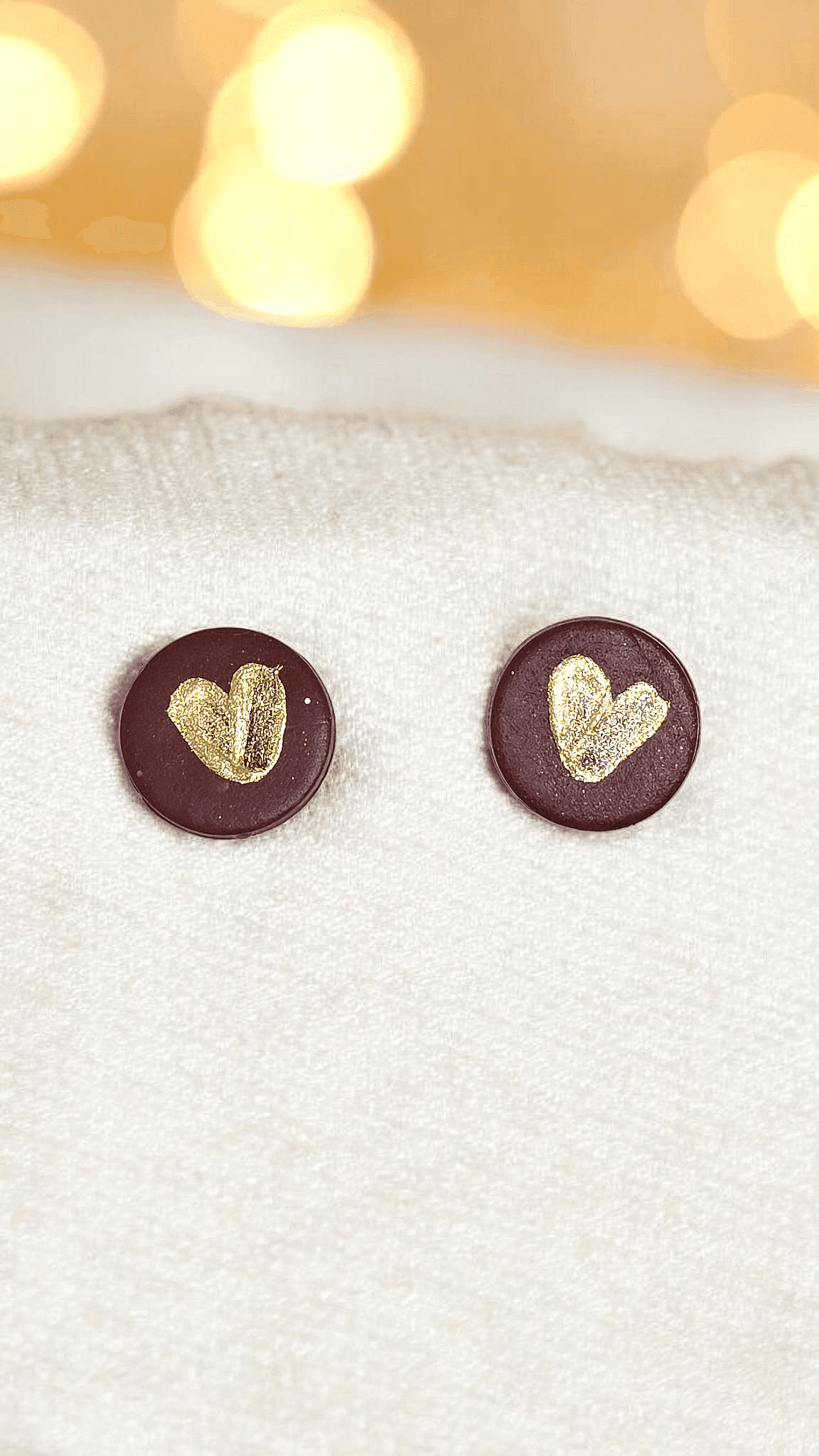 Ρομαντικά και καλλιτεχνικά, τα καφέ Μπορντό καρφωτά σκουλαρίκια διακοσμούνται στο κέντρο με ζωγραφισμένες χρυσές καρδιές.