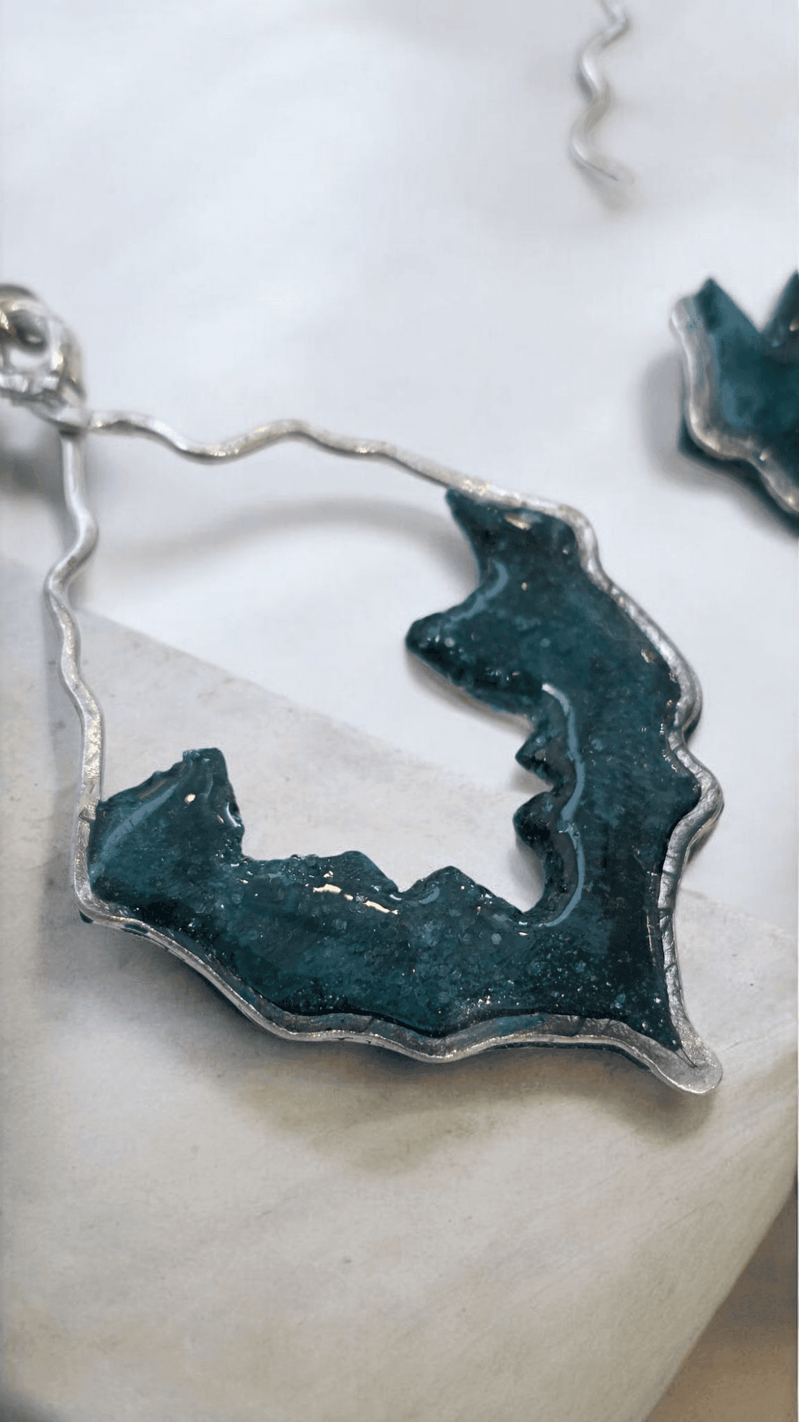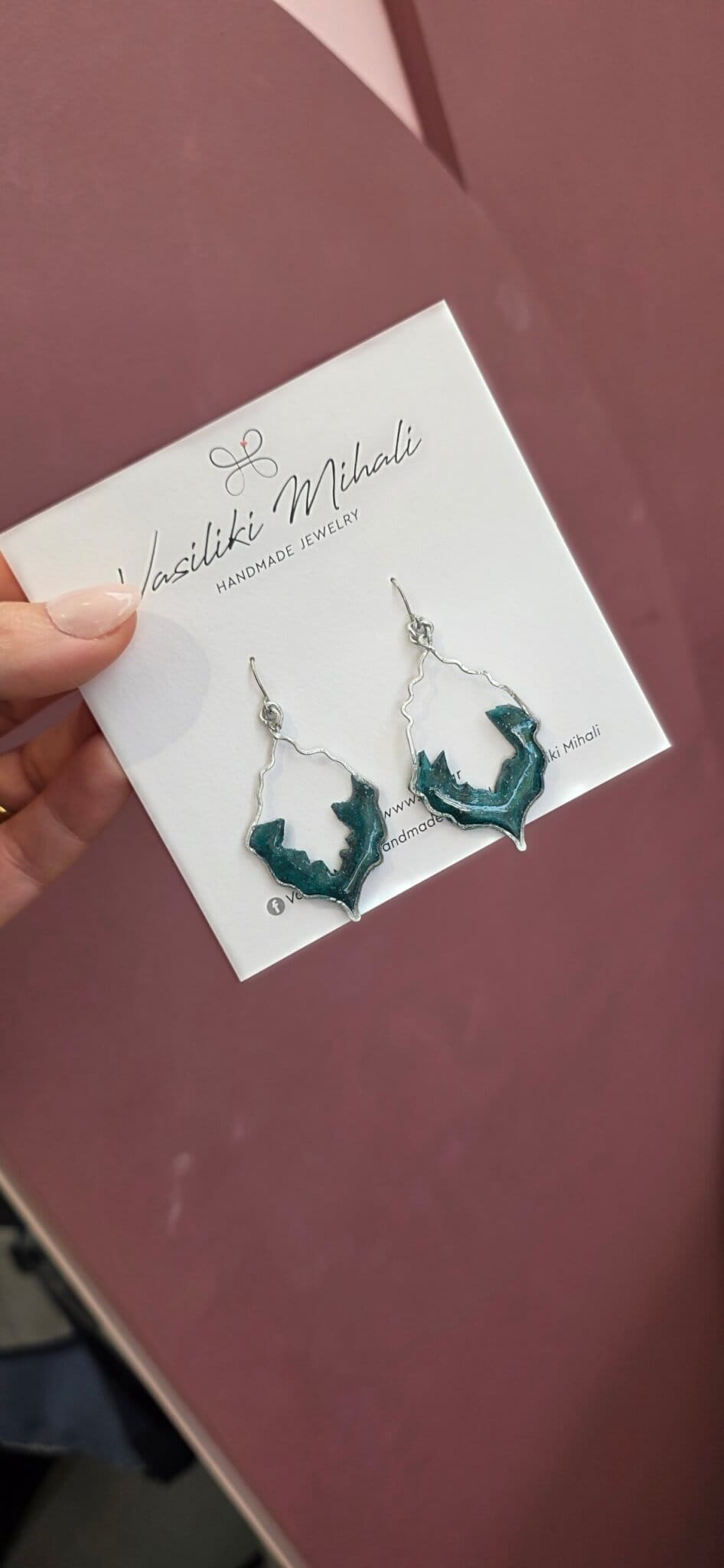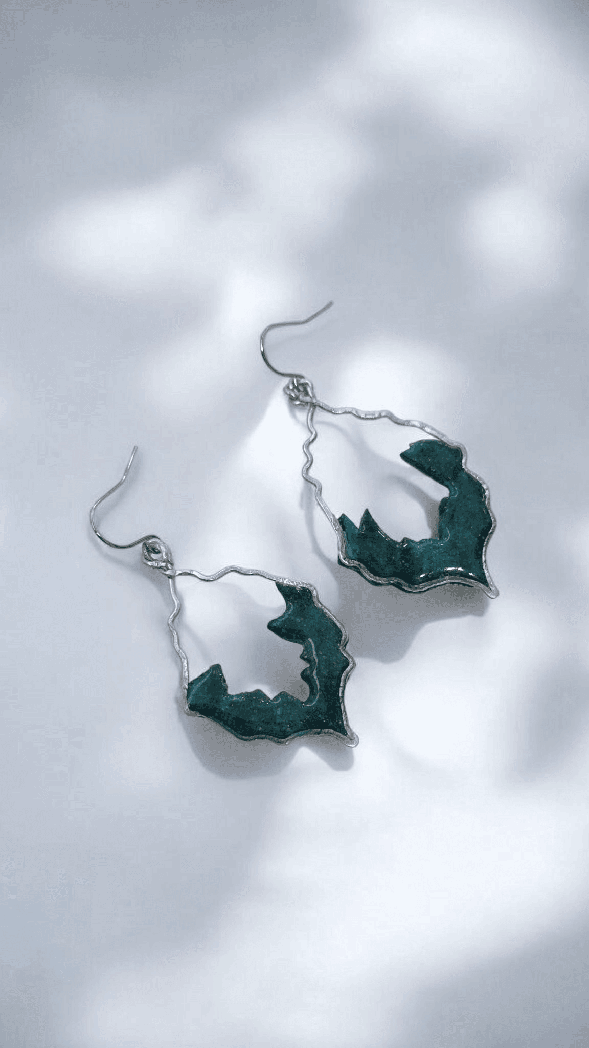 Στο εσωτερικό, ο πολυμερικός πηλός σε βαθύ πράσινο χρώμα δίνει ένταση και χαρακτήρα, ενώ το υγρό γυαλί προσθέτει μια μαγική γυαλάδα που κάνει τα σκουλαρίκια να ζωντανεύουν στο φως.