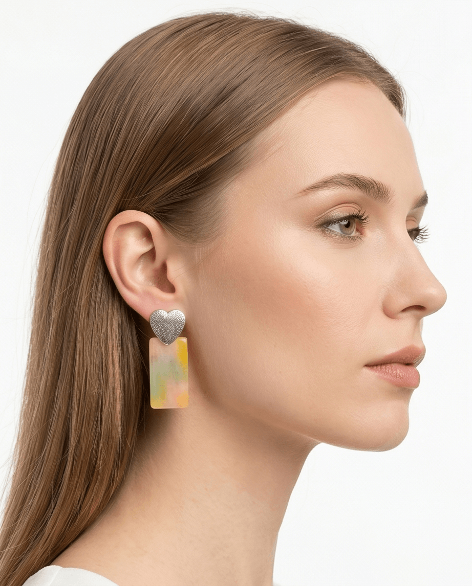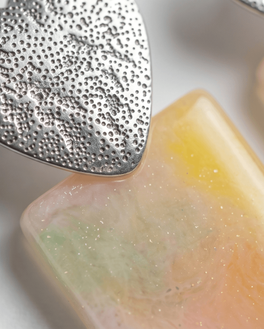 - Σχεδιασμός: Διαθέτουν ένα εντυπωσιακό ορθογώνιο στοιχείο από πολυμερικό πηλό σε απαλές pastel αποχρώσεις του κίτρινου, του ροζ και του πράσινου, που θυμίζουν ακουαρέλα. Το σχέδιο ολοκληρώνεται με μια ανάγλυφη καρδιά σε ασημί χρώμα που προσθέτει μια vintage πινελιά.